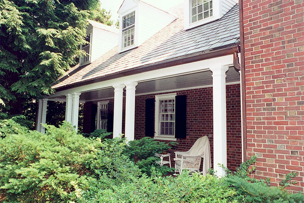 A grand 1930s brick Colonial-flavored house that was completely redone inside and out, including a large addition in the front and an infilled porch on the front. The design dials were turned up to create a truly glorious residence.